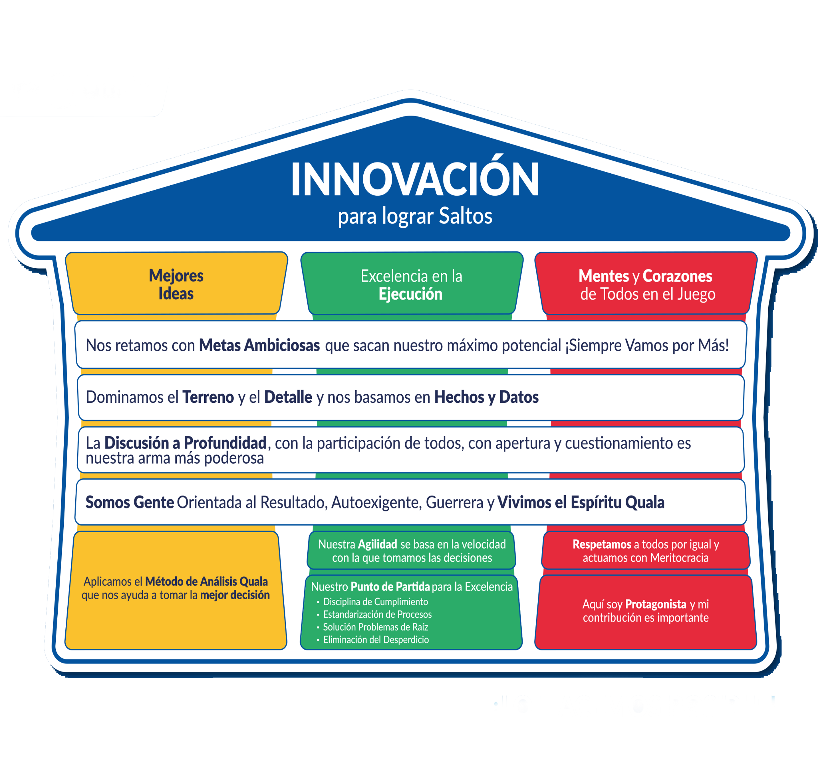 Cada uno de estos pilares es esencial, vital, no puede faltar ni fallar para garantizar que el techo de la innovación sea posible y sostenible. Estos pilares están soportados a su vez por seis “bloques” que representan los valores esenciales que son fundamentales para que tanto los pilares como el techo de nuestra cultura sean firmes.