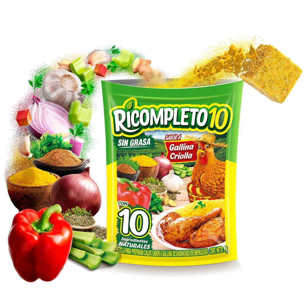 Ricompleto 10 es el primer caldo de gallina en polvo que lo tiene todo, porque combina el delicioso sabor a gallina criolla de los caldos tradicionales con una mezcla única de 10 ingredientes naturales, todo en un solo producto para realzar el sabor de tus comidas.